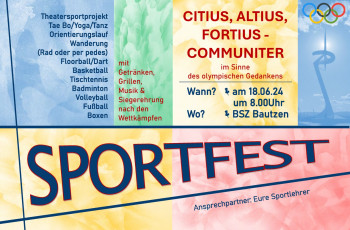 Am 18.06.2024 findet ab 8:00 Uhr unser Sportfest mit 16 verschiedenen Disziplinen statt. Als krönenden Abschluss kann man sich u.a. auf einen Grillnachmittag bei Musik und Getränken freuen. Update: Der Ablaufplan ist da ;)
