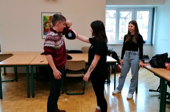 „Halt! Stop!“ schallt es durchs Haus 1 am letzten Schultag vor den Winterferien. Die Schülerinnen und Schüler der Berufsvorbereitung trainieren Abwehrhaltungen gegen Angreifer.
