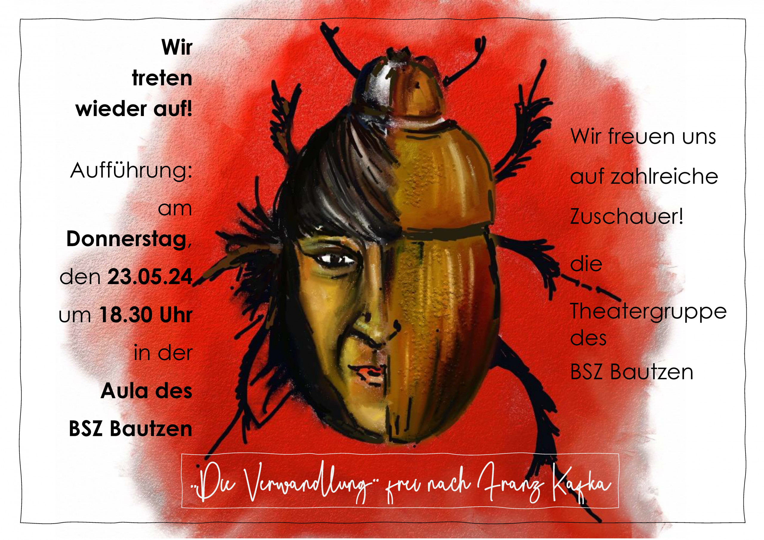 Nach dem großen Erfolg der ersten Vorstellung führt unsere Theatergruppe am Donnerstag, 23.05.2024 um 18:30 Uhr in der Aula des BSZ Bautzen nochmals "Die Vewandlung" frei nach Franz Kafka auf. Herzliche Einladung zum Zuschauen!