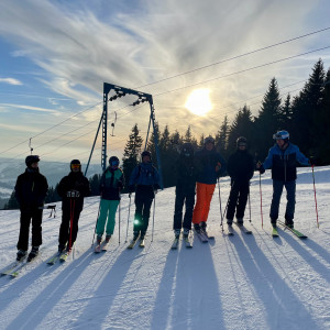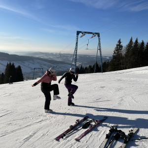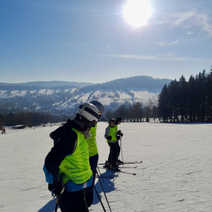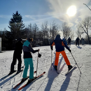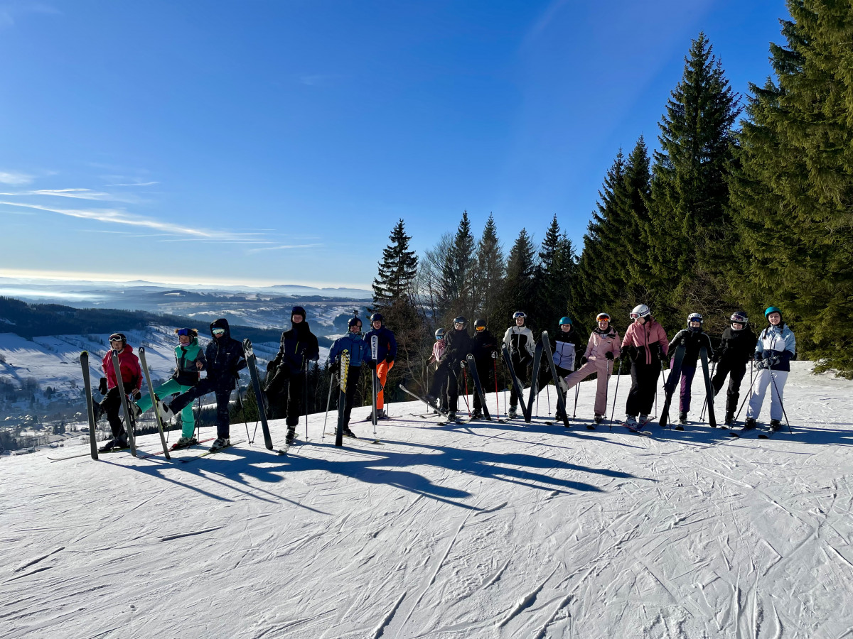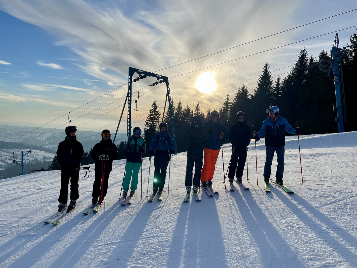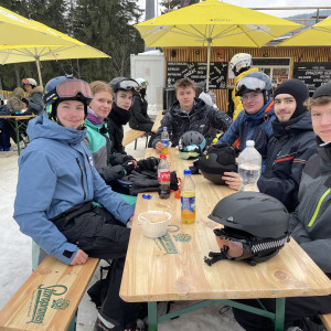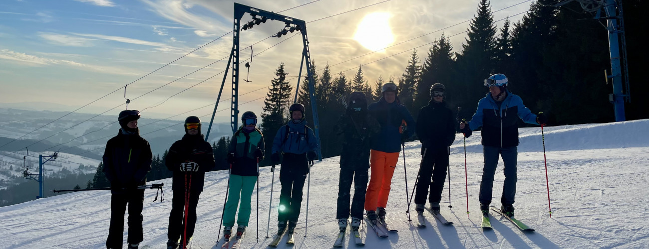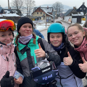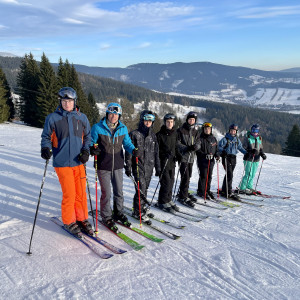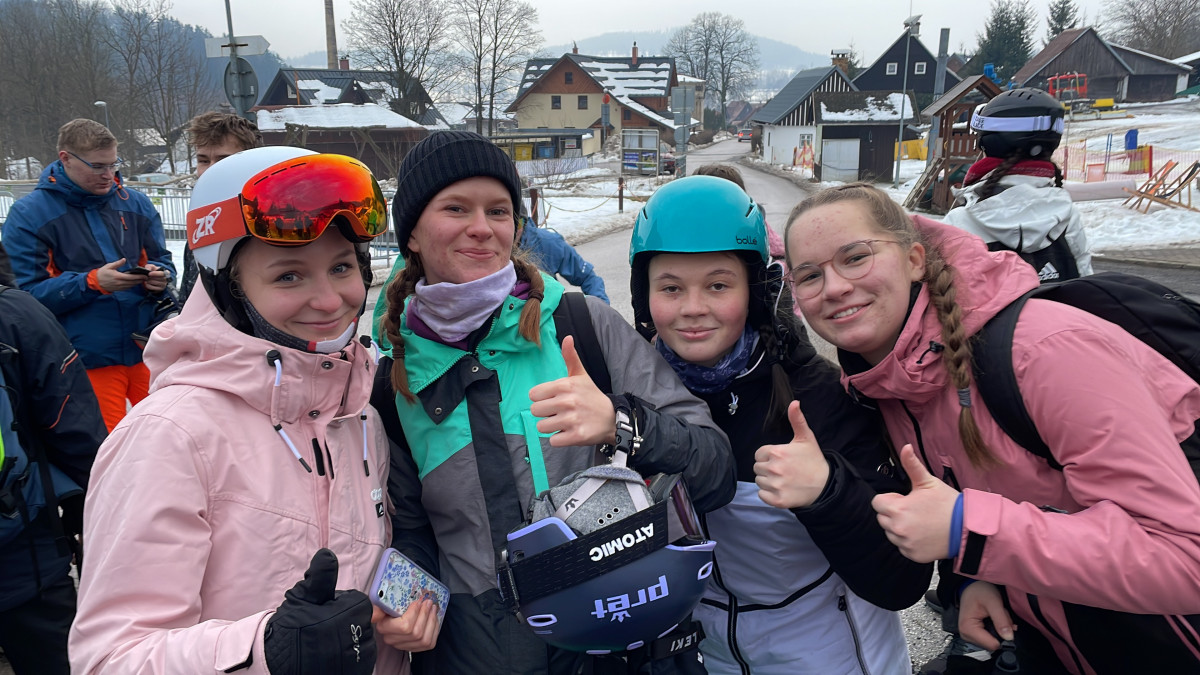 Nachdem wir am Sonntagmorgen um 8:45 Uhr das Gepäck im Bus verstaut hatten, konnten wir die Fahrt in Richtung Tschechien starten. Als wir in Rokytnice ankamen, ging es für uns zu Fuß weiter, da der Bus die Straße nicht hochfahren konnte. So erklommen wir den steilen Berg und bezogen im Anschluss unsere Zimmer. Während diejenigen die ihre Skier mithatten sich ausruhen konnten, ging der Rest der Gruppe die Ausrüstung im Tal abholen, danach stärkten wir uns beim Mittagessen. Damit alle Schülerinnen und Schüler ihre Fähigkeiten bestmöglich ausschöpfen konnten, wurden wir in drei Gruppen eingeteilt. Die Gruppe „Könner“ bestand aus den besten Fahrern unter uns, die Gruppe „Fortgeschrittene“ aus den erfahreneren Skifahrern und die Gruppe „Anfänger“ aus denjenigen, die das Skifahren erst vor Ort erlernt haben.