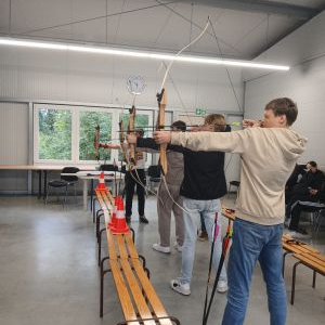 Die Leute vom Bogenschießen wurden nochmals in kleine Gruppen unterteilt und die erste Gruppe konnte beginnen, mit Pfeil und Bogen die Ziele unter Beschuss zu nehmen. Währenddessen spielten „der Rest“ und die Leute, die bereits geklettert waren, Tischtennis oder weitere Spiele und genossen die restliche Zeit im KiEZ Sebnitz.
